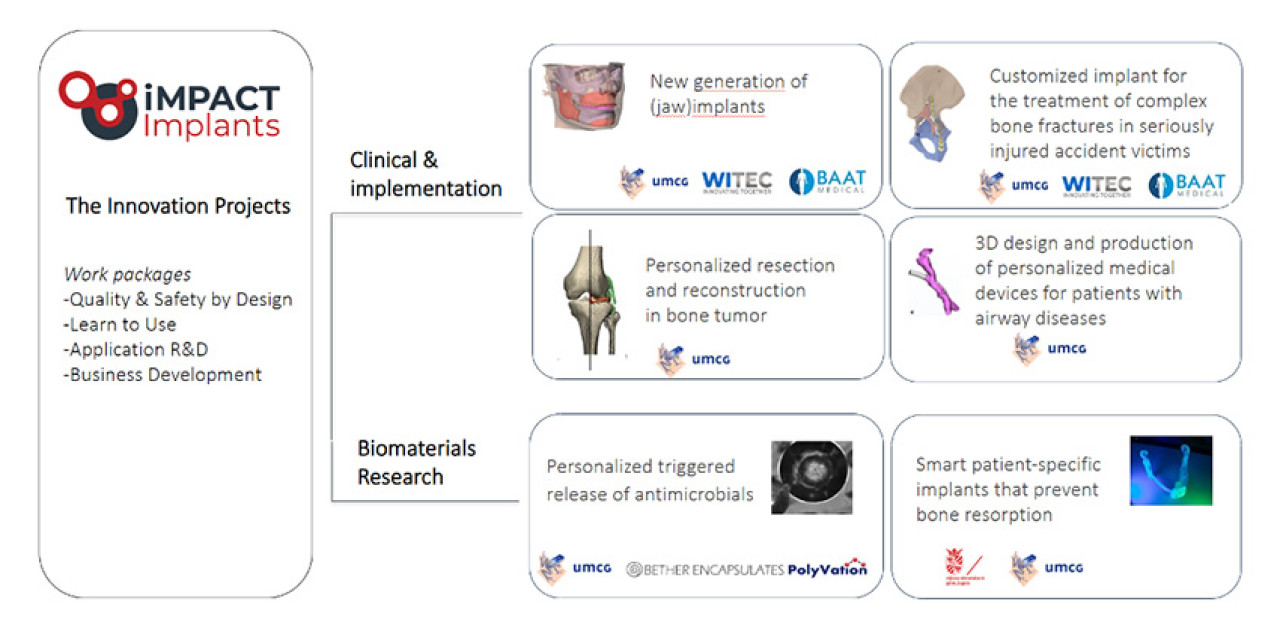 Roughly one year ago, the Just Transition Fund program IMPACT-Implants started. Regional partners from industry, research and healthcare embarked into a 3-year journey to optimize biomaterials and workflows for implant design to innovate the next generation of individualized 3D-designed devices, including implants for complex bone defects and fractures on knees, wrists, jaws and the airway. The partners includes the University Medical Centre Groningen (UMCG), represented by 9 academic and clinical departments, in collaboration with the MetaMechanics group of the ENTEG Institute of the Faculty of Sciences and Engineering of the University of Groningen, and regional companies WiTEC Innovating Together, Bether Encapsulates, BAAT Medical and the non-subsidize company PolyVation. The UMCG Innovation Center supported the initiation of the project and is involved in the program management.