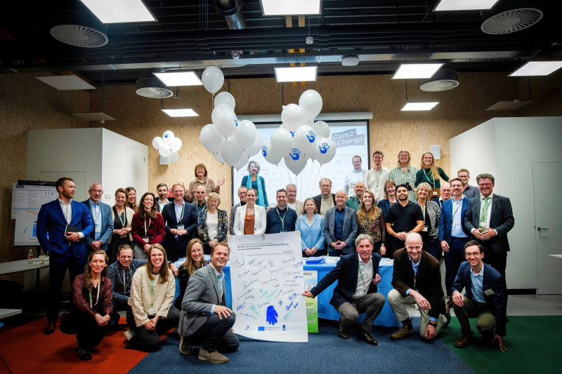 Duurzaamheid in de zorg versnellen Paulina Snijders, lid van de Raad van Bestuur UMCG en directeur Bart Volkers van Vereniging Circulair Groningen Drenthe (VCGD) openden de bestuurlijk netwerkbijeenkomst. Zij benadrukten het belang van de samenwerking tussen alle partners. Kunstenaar Maria Koijck gaf een inspirerende keynote over de verbeelding van ziekenhuisafval. UMCG Chief Green Officer Schelto Kruijff schetste mogelijkheden om duurzaamheid in de zorg te versnellen. Hij deelde inspirerende voorbeelden zoals het gebruiken van een herbruikbare isolatie jas die gewassen wordt. Projectleiders Sven Jurgens en Femke van der Zant schetsten hoe het consortium zich de afgelopen tijdsterk heeft ontwikkeld. Verschillende werkpakketten De bestuurders wisselden veel ervaringen en kennis uit en de Care2Changewerkpakketleiders gaven posterpresentaties. De werkpakketten houden zich onder andere bezig met het herontwerpen van single use producten in de zorg en het in kaart brengen van de CO₂ uitstoot van producten. Sven Jurgens: “Care2Change is het beginpunt om verder samen te werken aan de verduurzaming van de zorg. Wat zou het waardevol zijn als we door deze samenwerking een blauwdruk kunnen leveren voor anderen om hen te inspireren om ook te vergroenen”. Noord-Nederland voorbeeldfunctie Hanneke Bouwsema, secretaris speciaal regeringsvertegenwoordiger circulaire economie van het Ministerie van Infrastructuur en Waterstaat benadrukte dat het belangrijk is om klein te beginnen en stil te staan bij de duurzame initiatieven die al goed gaan. Ze noemde de regio Noord-Nederland een ‘voorbeeldfunctie’ voor Den Haag als het gaat om het verduurzamen van de zorg. Over het consortium Care2Change Care2Change is een samenwerking tussen het UMCG, RUG, Martini Ziekenhuis, Sterinoord, GS1/EAN Nederland, Boikon, Ommelander ziekenhuis, Treant, Frisius MC, NHL Stenden, Hanzehogeschool, Vereniging Circulair Friesland, Life Cooperative, Vereniging Circulair Groningen Drenthe, Bedrijfsnetwerk Groene Chemie Drenthe (SUSPACC), Milieuplatform Zorg, Nij Smellinghe, Pezy Product Design, 8D Games, House of Design, Antonius Ziekenhuis, NOM, Menzis, De Friesland, Ecoras, BBENG, provincie Groningen, provincie Drenthe, gemeente Groningen, gemeente Assen, gemeente Leeuwarden en gemeente Emmen. En deels betaald vanuit de EFRO-gelden van SNN met daarbij een cofinanciering van de deelnemende organisaties. Meer informatie Meer weten over Care2Change en het consortium? Lees dan: UMCG trots op nieuwe samenwerking die uitstoot terugdringt: Care2change Meld je aan voor onze nieuwsbrief en denk jij iets bij te kunnen dragen aan dit collectief? Meld je dan aan als 'Vriend van Care2Change' via dit formulier: Aanmelden Vrienden van Care2Chang Bron artikel: Care2Change