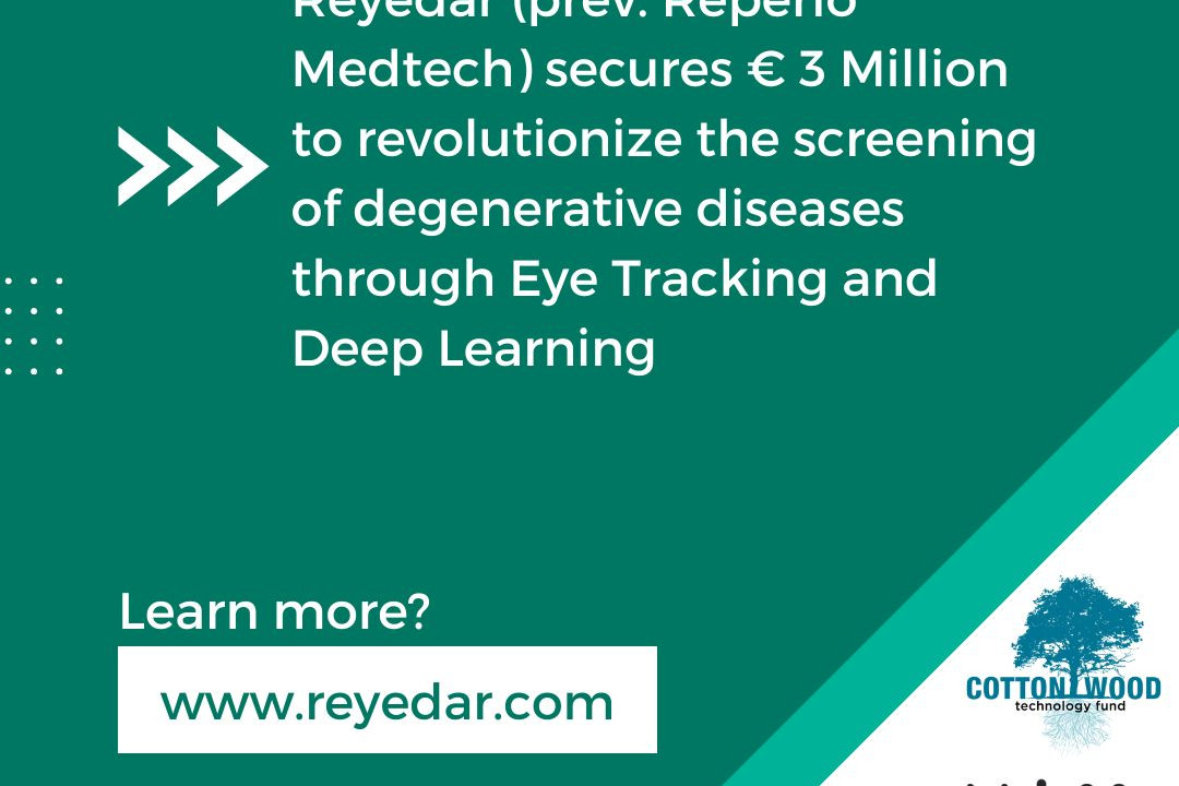 Reyedar, een deeptech startup en LIFE Cooperative lid die vroegtijdige screening van leeftijdsgerelateerde degeneratieve ziekten mogelijk maakt, kondigt vandaag aan dat het een investering van € 3 miljoen heeft binnengehaald om zijn baanbrekende oplossing verder te ontwikkelen. Reyedar ontwikkelt een eigen medisch technologieplatform op basis van eye tracking en deep learning waarmee veel symptomen van leeftijdsgerelateerde ziekten vroegtijdig kunnen worden gedetecteerd. De financieringsronde wordt geleid door Cottonwood Technology Fund, een toonaangevend durfkapitaal fonds dat investeert in technologiebedrijven in een vroeg stadium. NOM, Pupil Labs, Uneti Ventures en de reeds bestaande investeerder Blue Sparrows MedTech Fund doen ook mee in deze investeringsronde.